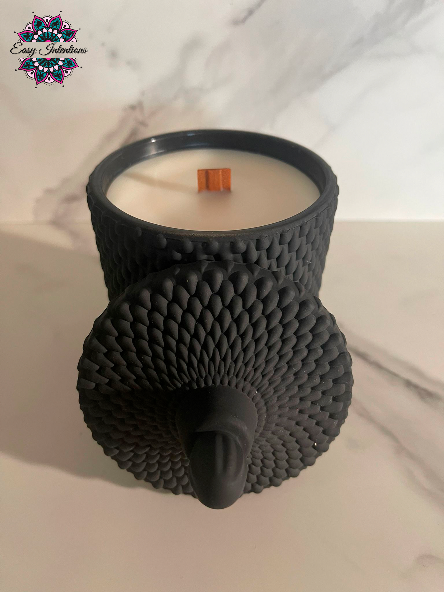 Crackling Wooden Wick Candle made with a combination of soy wax, other vegetable waxes, food grade paraffin, and proprietary ingredients.