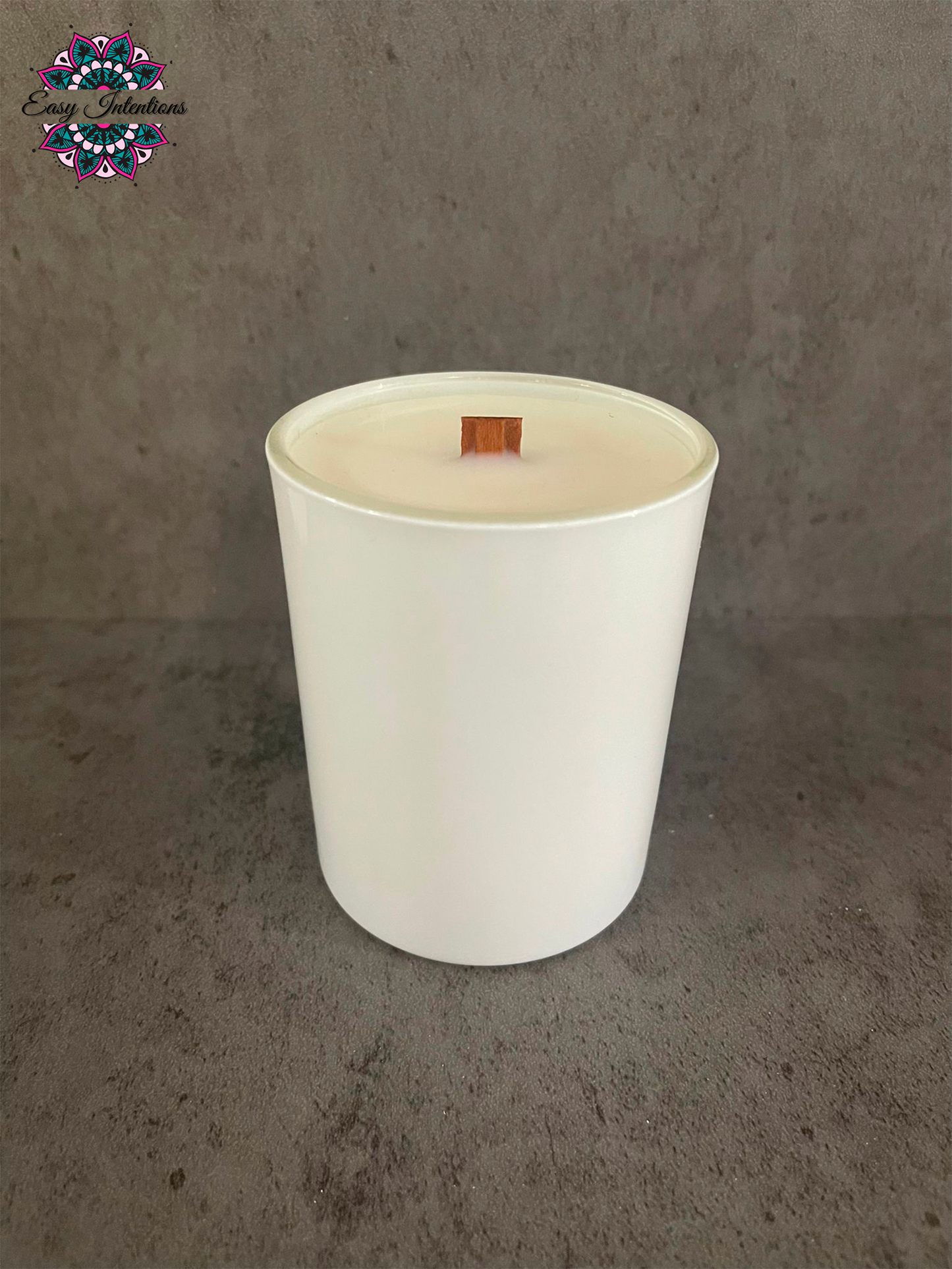 Crackling Wooden Wick Candle made with a combination of soy wax, other vegetable waxes, food grade paraffin, and proprietary ingredients.
